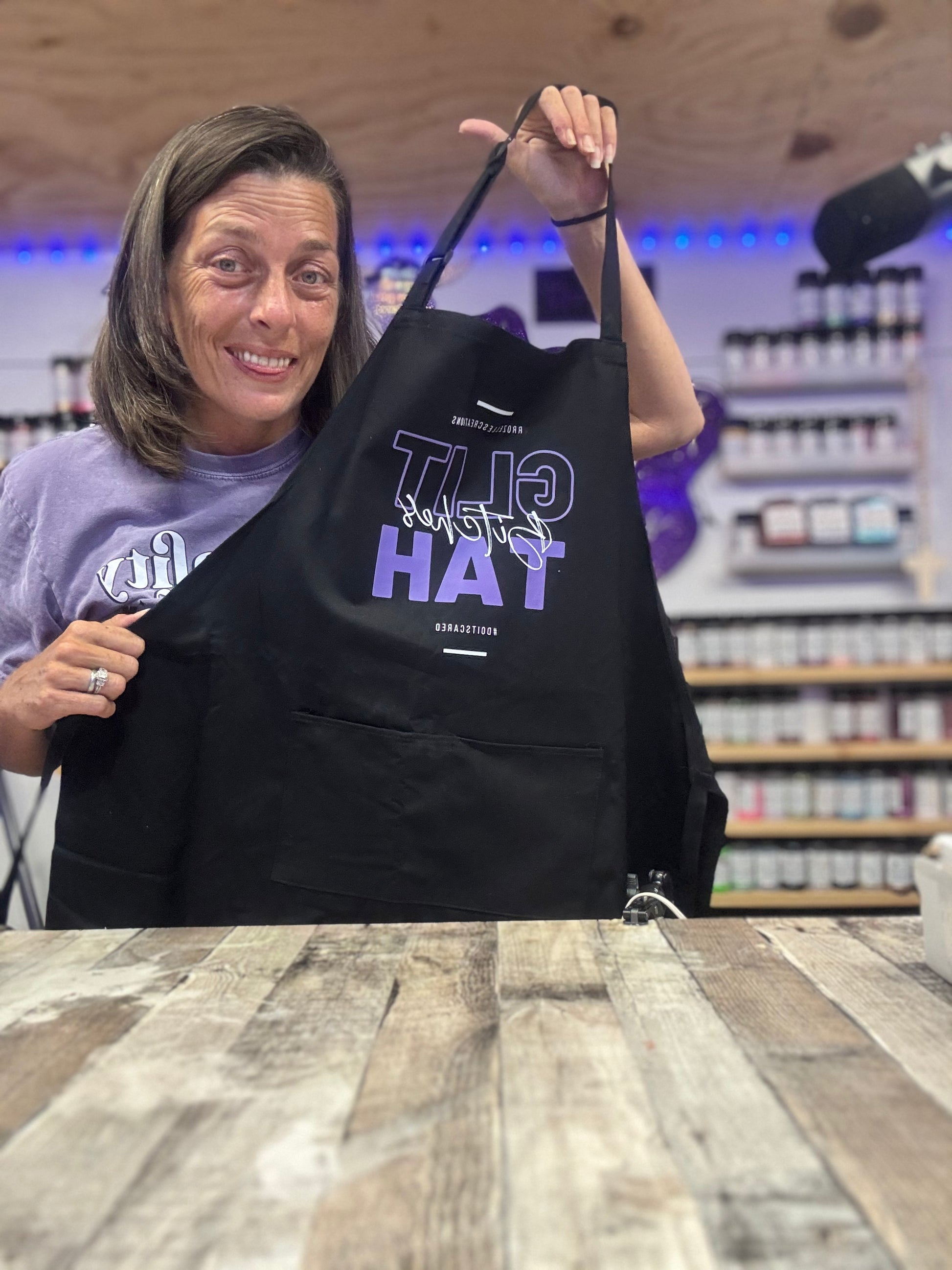 The photo shown above is digital mockup of the design, so the final product might be slightly different (such as slightly different dimensions to make the design look the best it can on the actual Apron).My logo will NOT be on apron, only the Glittah Bitches design shown above.